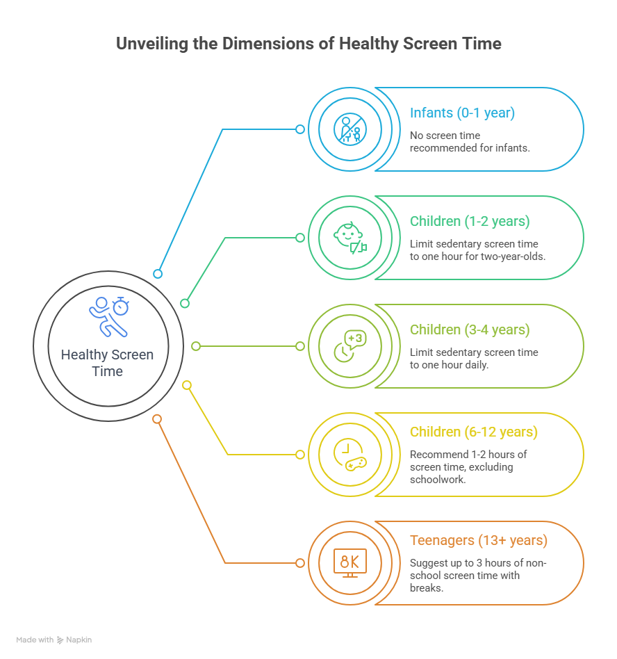 Teenagers aged 13 and above | Up to 3 hours of non-school screen time, with breaks, is suggested. |
