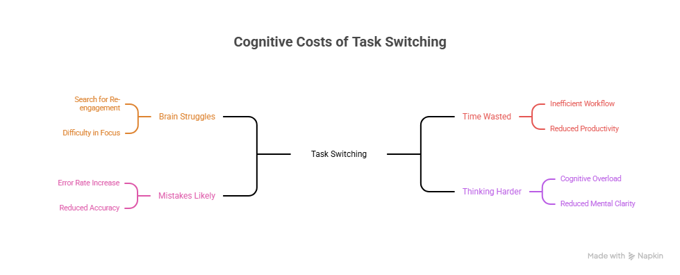 Switching between tasks costs the brain. This is like going from studying to social media. This is a 'task-switching penalty'. After switching, the brain struggles to get back on track. It has to search to re-engage. Each switch wastes time. It also makes mistakes more likely. This makes thinking harder. It uses up working memory. This leads to lower test scores. It means students need more study time. This is to learn things well. It also causes less concentration. This shows the real impact. This is on student attention spans in the digital age.