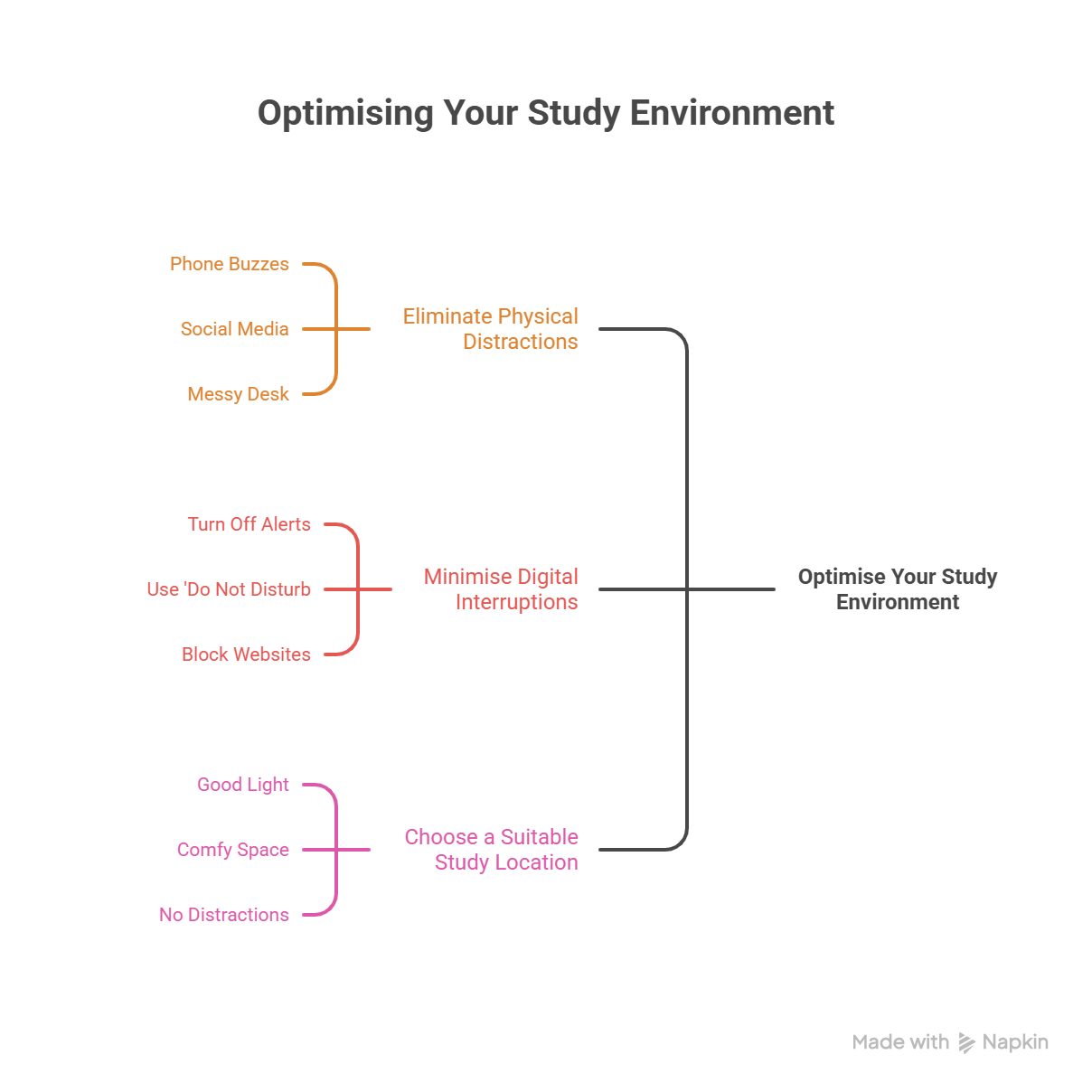 Many things can distract you. Your phone buzzes a lot. It can stop your study. Social media is very tempting. A TV in the background can distract you. A messy desk is also bad. Notes and books everywhere make it hard to focus. Too much noise can distract you. A room that is too quiet can also distract you. Bad chairs make you move around. Bad light hurts your eyes. Find these distractions. Get them out of your study area. This helps you start studying. Your mind will be clear.